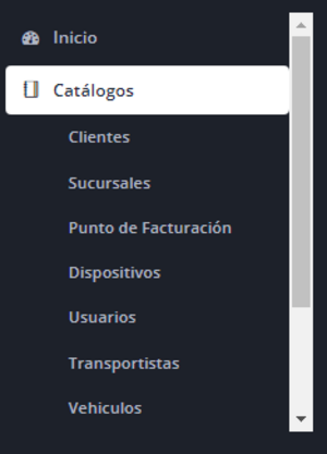 Los clientes, productos, sucursales, puntos de facturación, dispositivos, usuarios, transportistas y Vehículos son manejados en el portal mediante catálogos. Ver siguiente imagen